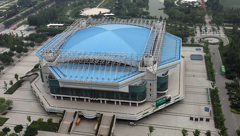 西安市體育館于1997年開始建設(shè),1999年8月竣工。它是西安體育中心的標(biāo)志性建筑,先后承辦了第四屆城市運(yùn)動(dòng)會(huì)體操比賽和閉幕式,中國(guó)東西部經(jīng)濟(jì)合作與貿(mào)易洽談會(huì)開幕式等活動(dòng)。采用寶鋼海藍(lán)PE聚酯彩涂。基板為180克/平方米的熱鍍鋅,牌號(hào)為TSt01。使用了12年后,涂層顏色依然鮮艷.