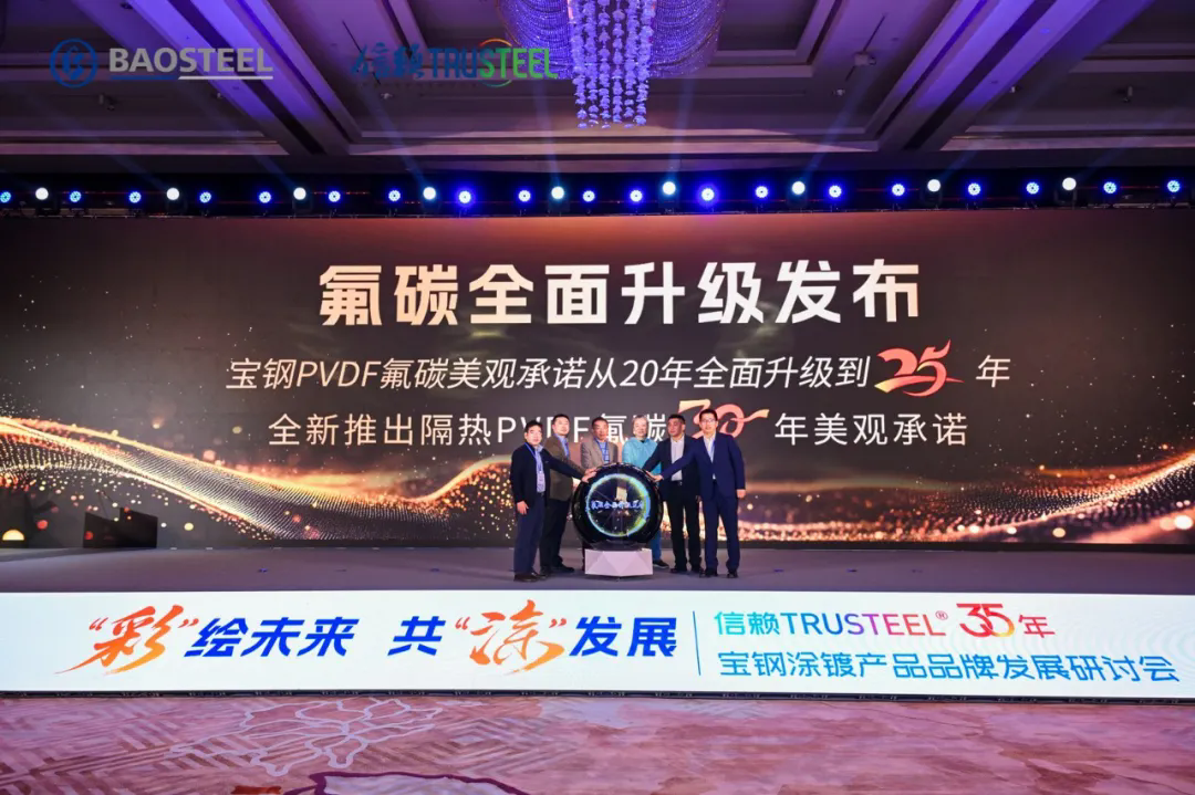 在與會嘉賓的共同見證下,寶鋼鄭重宣布對氟碳彩涂產品的質量承諾實現跨越式提升:將已堅守二十余年的20年質保標準,一舉提升至25年。與此同時,寶鋼更進一步,同步推出了具備優異隔熱性能的 “隔熱氟碳30年” 全新標準。