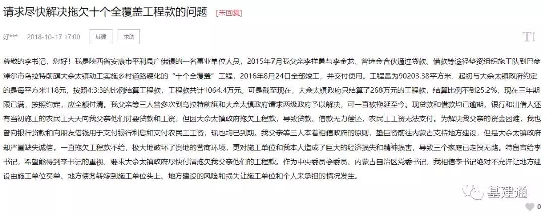 一名在內蒙古支援建設的網友發(fā)帖求助,2015年網友承接了鄉(xiāng)村道路硬化工程,工程款共計1064.4萬元。2018年工程竣工并交付使用后,政府只結算了268萬元。網友在留言中表示,“政府拖欠工程款,導致貸款、借款無力償還,農民工工資無法支付。”