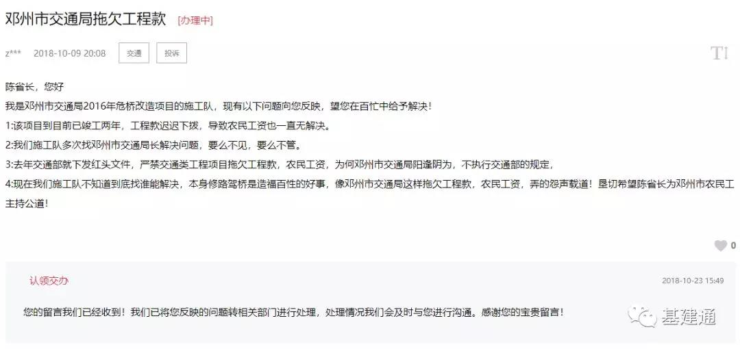 河南網友在2016年與政府簽定了危橋改造項目,工程款卻遲遲不下?lián)埽瑢е罗r民工工資也一直沒有解決。